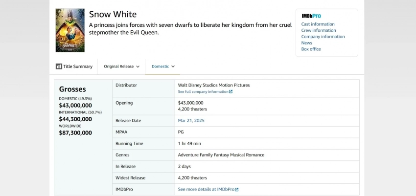 На внутреннем рынке «Белоснежка» показала самые низкие дебютные сборы среди ремейков Disney.