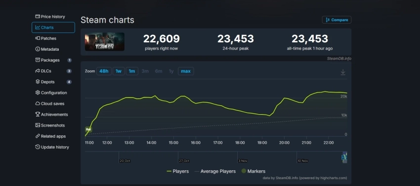 Онлайн Escape from Tarkov в сервисе Valve (после изначального периода роста, небольшого снижения и нового роста) достиг отметки в 23,453 игрока.