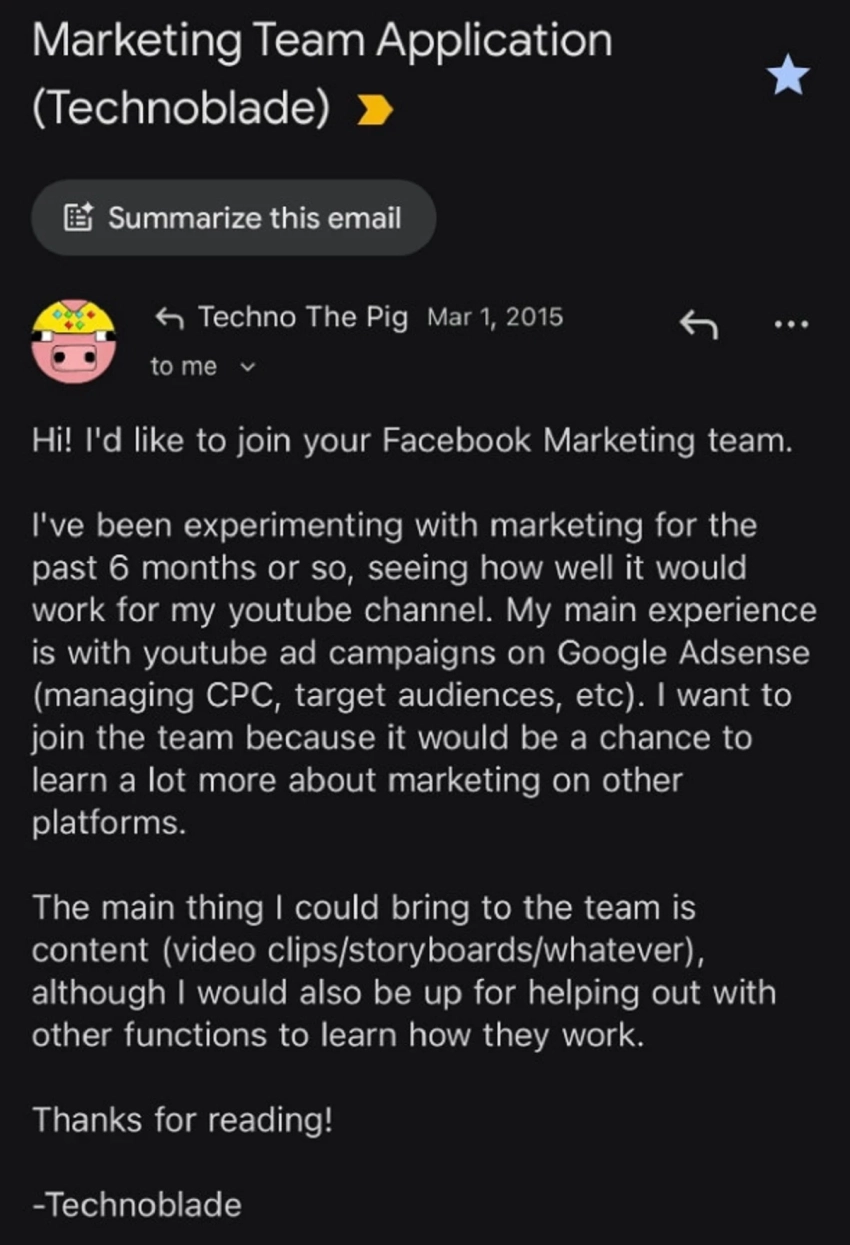 Заодно Саймон поделился интересным фактом. Разработчик показал письмо, которое Technoblade прислал в Hypixel Studios в 2015 году. Юный блогер хотел стать частью маркетинговой команды сервера Hypixel, но не подходил по возрасту для официального трудоустройства.