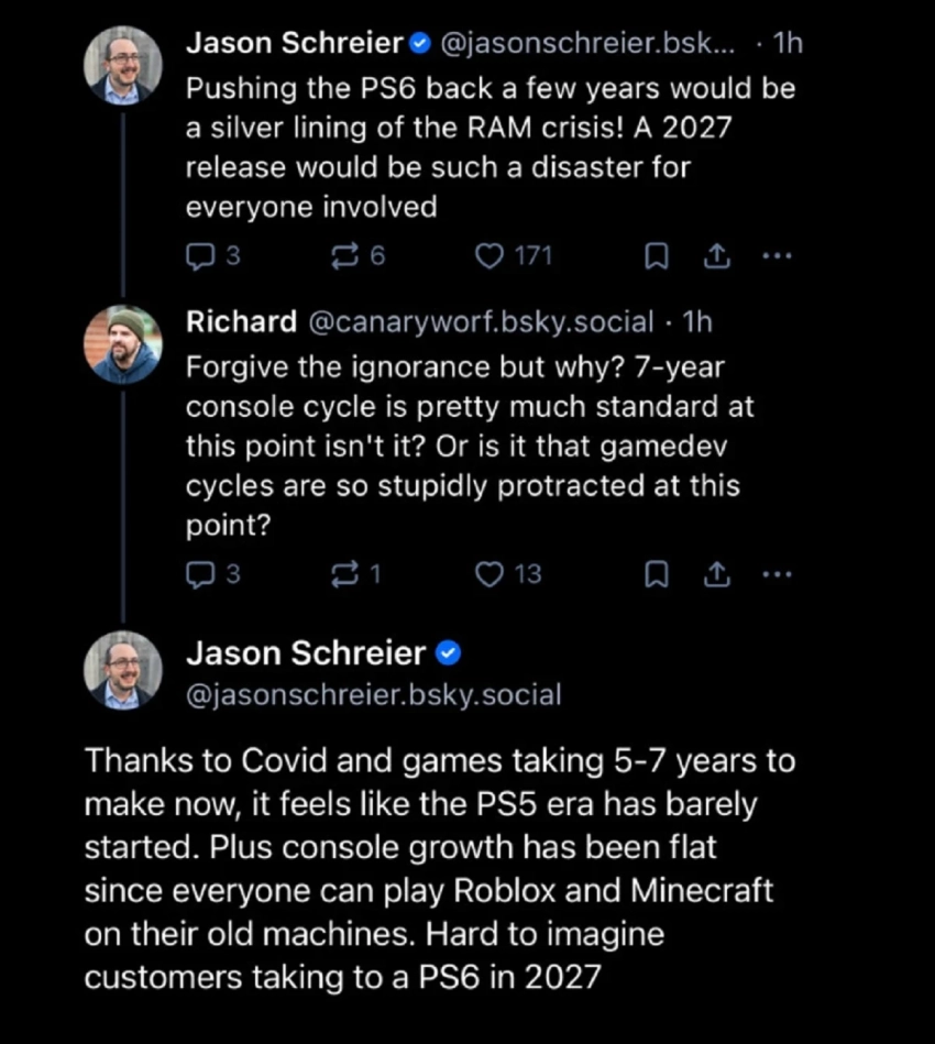 Также Шрайер отметил, что консоли не показывают рост продаж из-за возможности запускать популярные хиты на старом «железе». Например, Minecraft и Roblox без проблем чувствуют себя на PlayStation 4. Из-за этого многие игроки попросту сочтут нецелесообразной покупку PS6 в 2027 году.