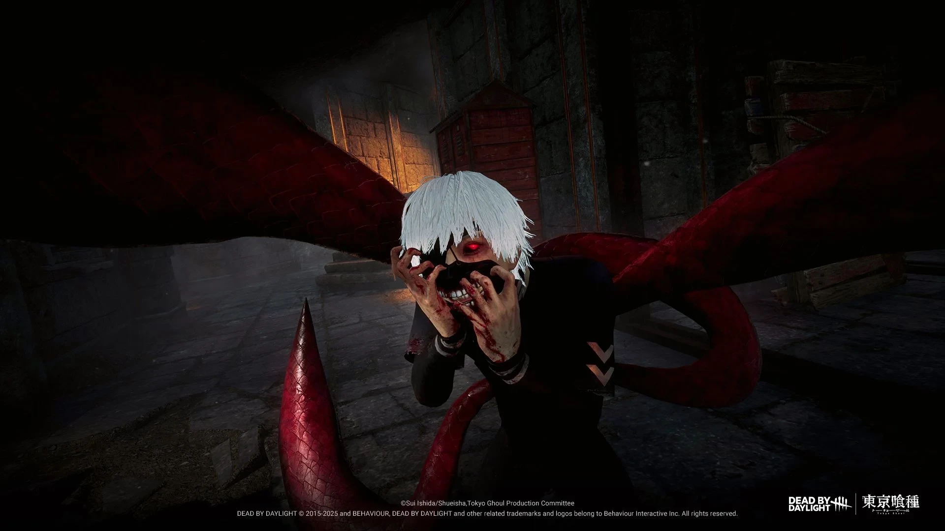 Одноглазый ужас сможет передвигаться и прыгать, опираясь на щупальца Кагуне, при этом выжившие, попавшие в зону действия, будут захвачены и ранены. В режиме ярости гуль может быстрее прыгать и атаковать выживших. А перки нового убийцы позволяют наносить выжившим проклятия и, при выполнении ряда условий, блокировать на время все окна и генераторы.