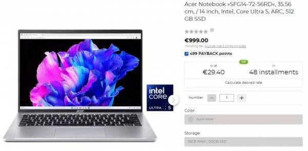 Версия Acer Swift (SFG14-72-7186) с более производительным Core Ultra 7 155H с частотой от 3,8 до 4,9 ГГц, 32 Гбайт ОЗУ, SSD объёмом 1 Тбайт и таким же дисплеем оценивается продавцами в 1249 евро ($1360). Для обоих лэптопов также заявляется время автономной работы до 11 часов. На фоне других моделей Acer Swift на базе всё ещё актуальных процессоров текущей серии Raptor Lake у тех же ретейлеров обновлённые модели с чипами Meteor Lake по цене практически не отличаются.