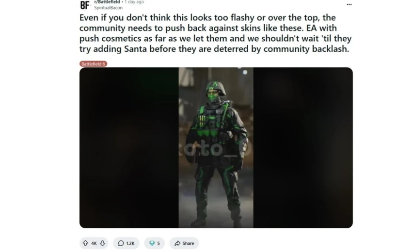 «Даже если лично вам это не кажется слишком кричащим или вычурным, сообществу нужно дать отпор подобным скинам. EA [будет] прощупывать границы косметики и раздвигать из настолько, насколько мы им позволим. И мы не должны дожидаться момента, когда она попробует добавить Санту, но передумает из-за негативной реакции сообщества», — пишет автор поста.