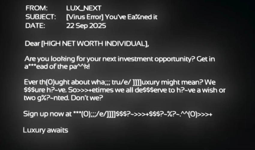 Загадочное письмо призывает читателя воспользоваться «инвестиционной возможностью». Прочитать текст трудно из-за множества символов, из которых состоит и «битая» ссылка в конце письма. Только вот весь текстовый мусор оказался шифром, разгадка которого привела фанатов на сайт Samsara — вымышленного премиального отеля.